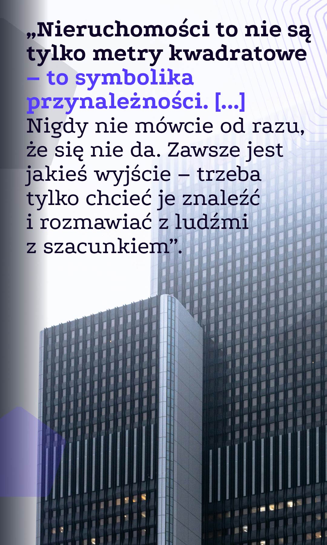 „Nieruchomości to nie są tylko metry kwadratowe – to symbolika przynależności. [...] Nigdy nie mówcie od razu, że się nie da. Zawsze jest jakieś wyjście – trzeba tylko chcieć je znaleźć i rozmawiać z ludźmi z szacunkiem”.