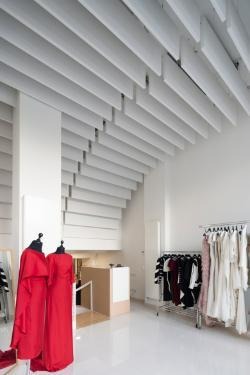 Sufit pomimo tego, że jest biały może mieć ciekawą formę – z lewej wykorzystanie pionowych Baffli akustycznych w butiku hiszpańskich projektantów Nicholas & Atienza w Madrycie (fot. Miguel de Guzmán). Pionowe panele mogą też być elementem kolorowej gry formy i światła na suficie – jak w markecie Univerexport w mieście Novi Sad w Serbii (fot. Marko Cvetkovic Cvele)