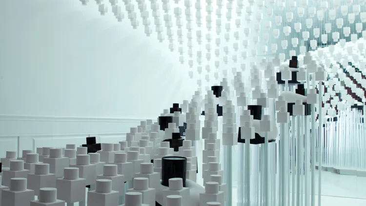 Jednym z przykładów tymczasowych przestrzeni wystawienniczych jest instalacja zapachowa w NYC Odin Fragrances. To świetny przykład na to, że można połączyć retail z instalacją artystyczną. Wnętrze zaprojektowano w taki sposób, aby produkty eksponowane były w formie instalacji – wykonano gipsowe odlewy flakonów perfum, które przypominały formy stalaktytów i stalagmitów. Nadało to przestrzeni wyjątkowej, surrealistycznej atmosfery.